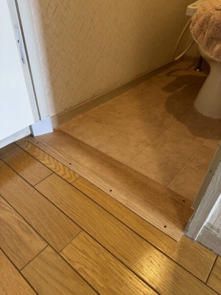 夜間トイレに行くことが多いため、転倒防止策としてトイレの敷居を撤去。またドアノブに関しても操作が容易に行えるレバー式へと変更 対象となるものに関しては補助事業を活用しお客様には1割負担で工事完了。施工後は段差がなくなったことで夜間のトイレも安心との嬉しいお言葉をいただきました 補助事業の申請に関しても弊社が全て行いますので安心してください