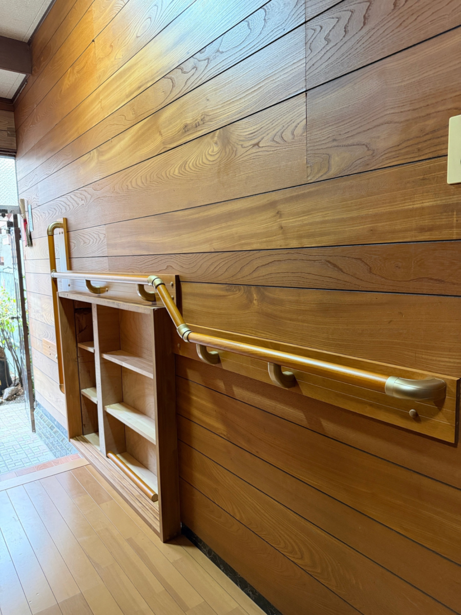手すりを連続でとりつけました。下駄箱も新しくし、明るい雰囲気の玄関となり大変喜ばれました。